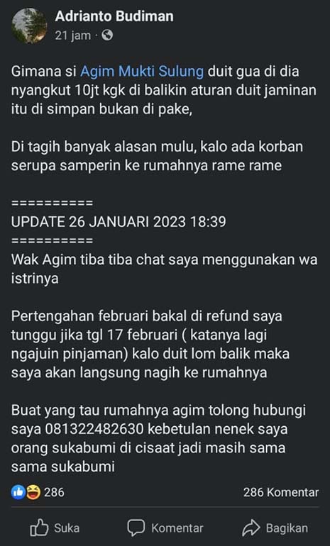 Update: Beberapa waktu lalu ada pengguna Facebook yang membuat postingan. Intinya, Agim Mukti Sulung melakukan penipuan dengan cara menggunakan uang rekber untuk kepentingan pribadi.